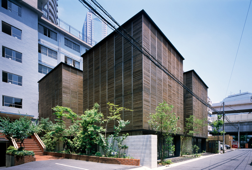 都会の中で外周を囲う杉のルーバーが美しく映えており都市景観の木質化のモデル的事例である