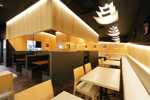 焼き鳥のチェーン店に積極的に木材利用をしており、連続するなぐり加工の壁が美しい