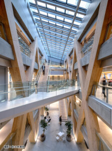 4階ラウンジエリア。レシプロカル構造の耐火木造大屋根による無柱架構。光、風、木、緑に満たされるウエルネスな空間を創出。